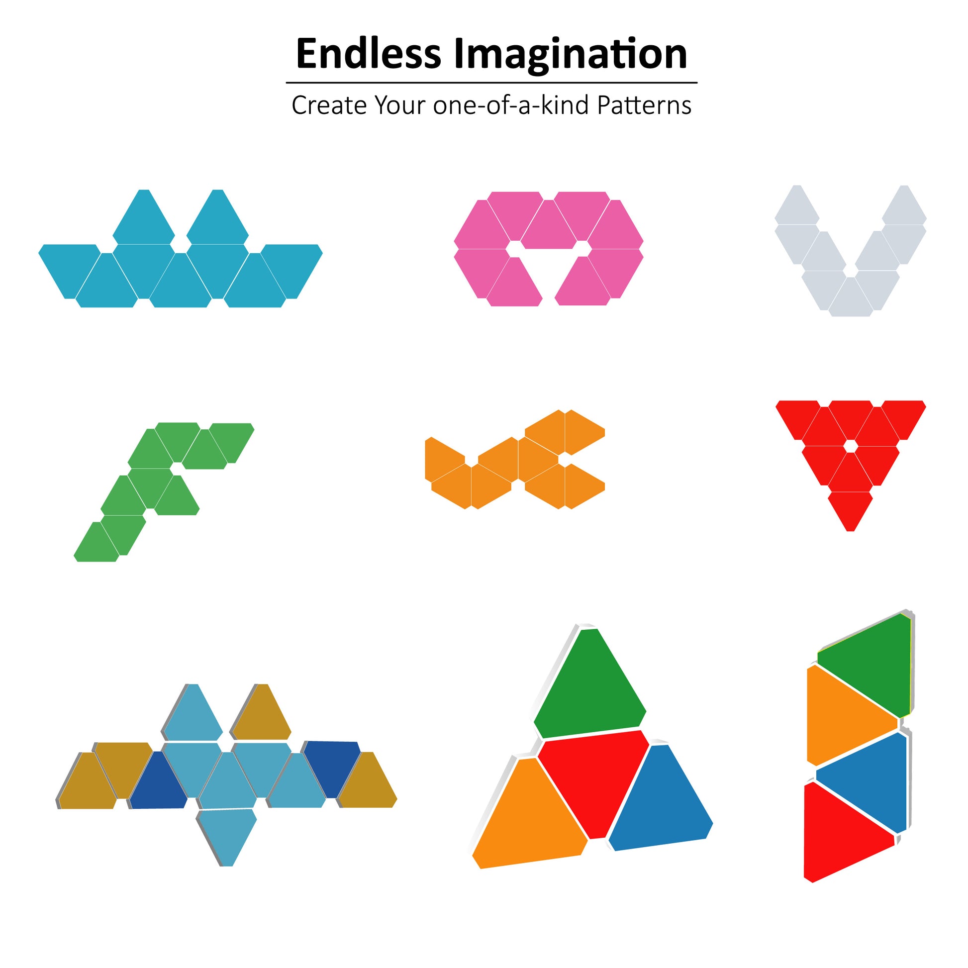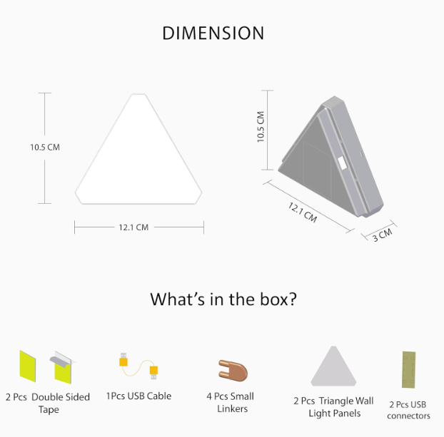 - Easy setup and Installation: The Box contains 2 triangle Wall light Panels, USB connectors, small linkers, USB cable, 2 double sided tape and a user manual. Simply connect the panels, apply the adhesive and mount them on a clean flat surface.